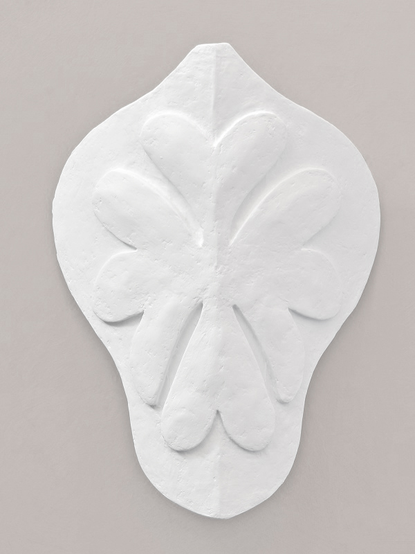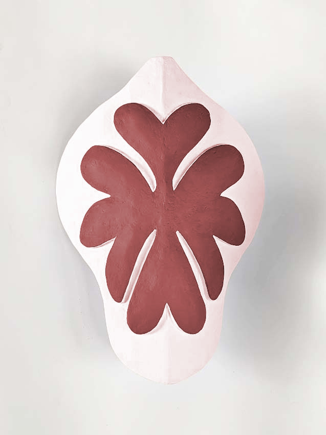 Shield shaped wall light with and abstract floral form in relief with tactile and textured surface. The central flower/leaf design is hand painted in a claret colour.