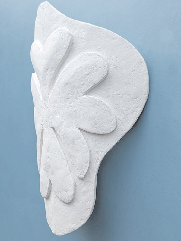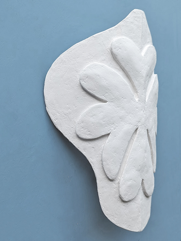 Shield shaped wall light with and abstract floral form in relief with tactile and textured surface. The central flower/leaf design is hand painted in blue.
