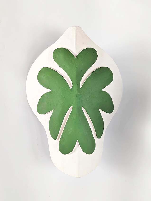 Shield shaped wall light with and abstract floral form in relief with tactile and textured surface. The central flower/leaf design is hand painted in green