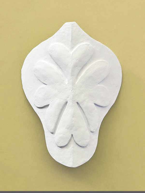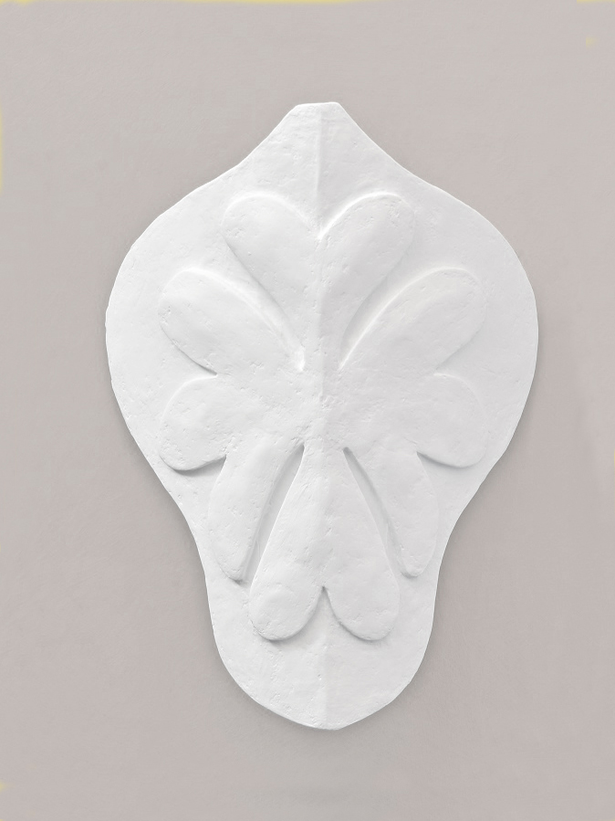 Shield shaped wall light with and abstract floral form in relief with tactile and textured surface.