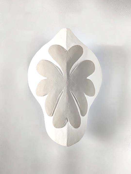 Shield shaped wall light with and abstract floral form in relief with tactile and textured surface. The central flower/leaf design is hand painted in mushroom colour.