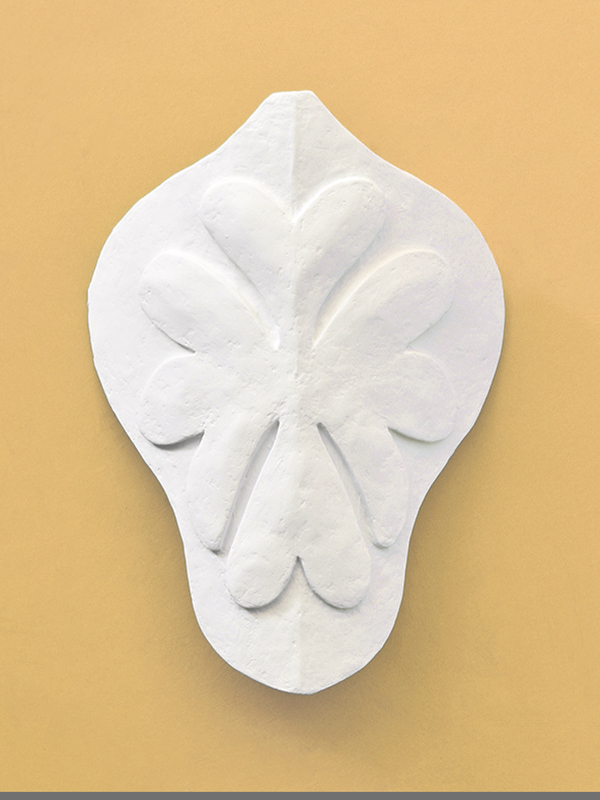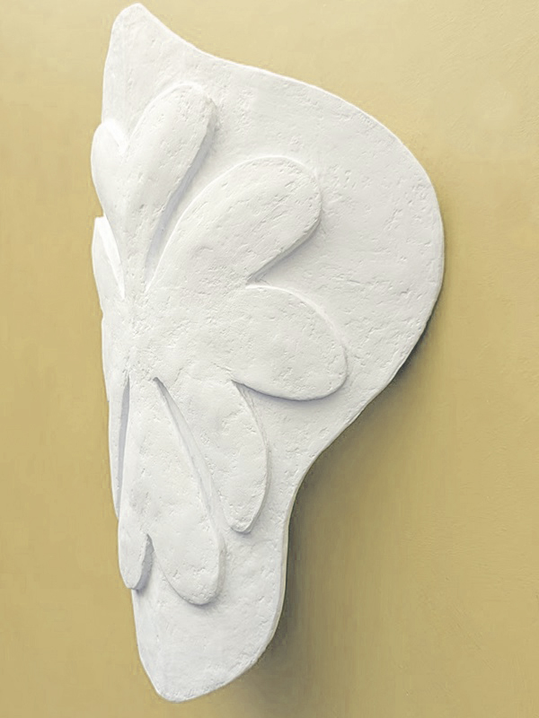Shield shaped wall light with and abstract floral form in relief with tactile and textured surface. The central flower/leaf design is hand painted in golden yellow colour.